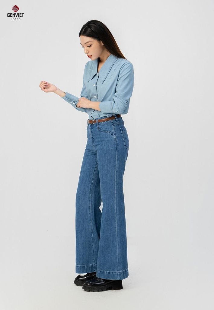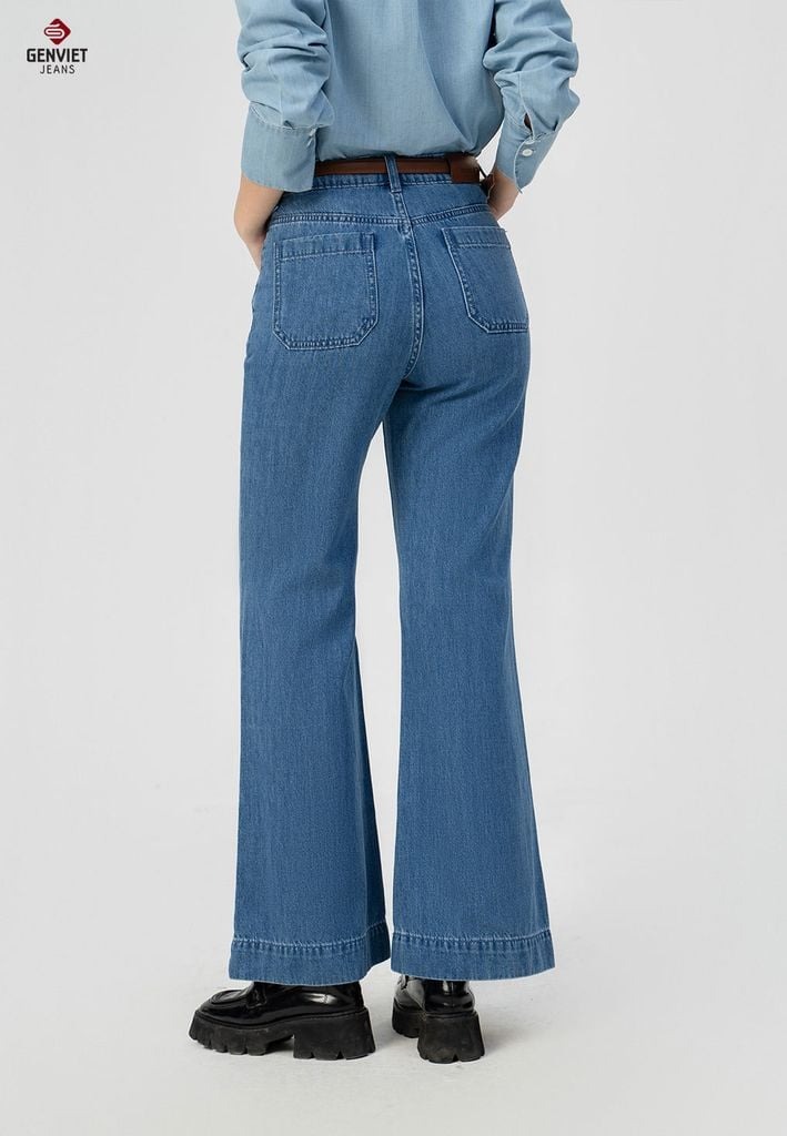Đường may chắc chắn, có đinh tán (rivet) ở túi để tăng độ bền, màu xanh chàm (indigo).
