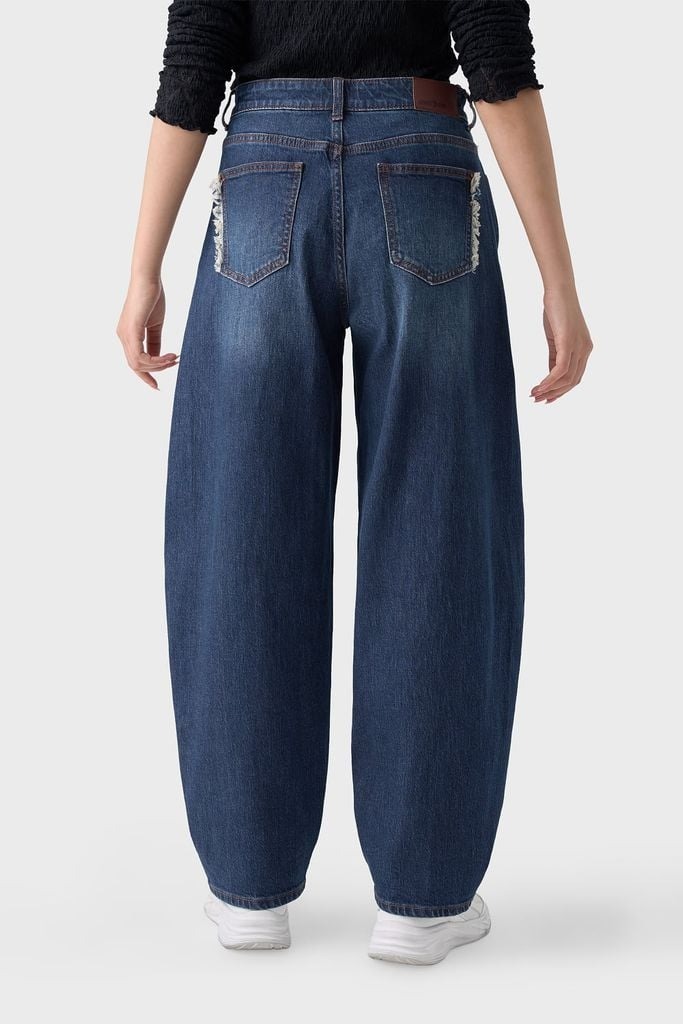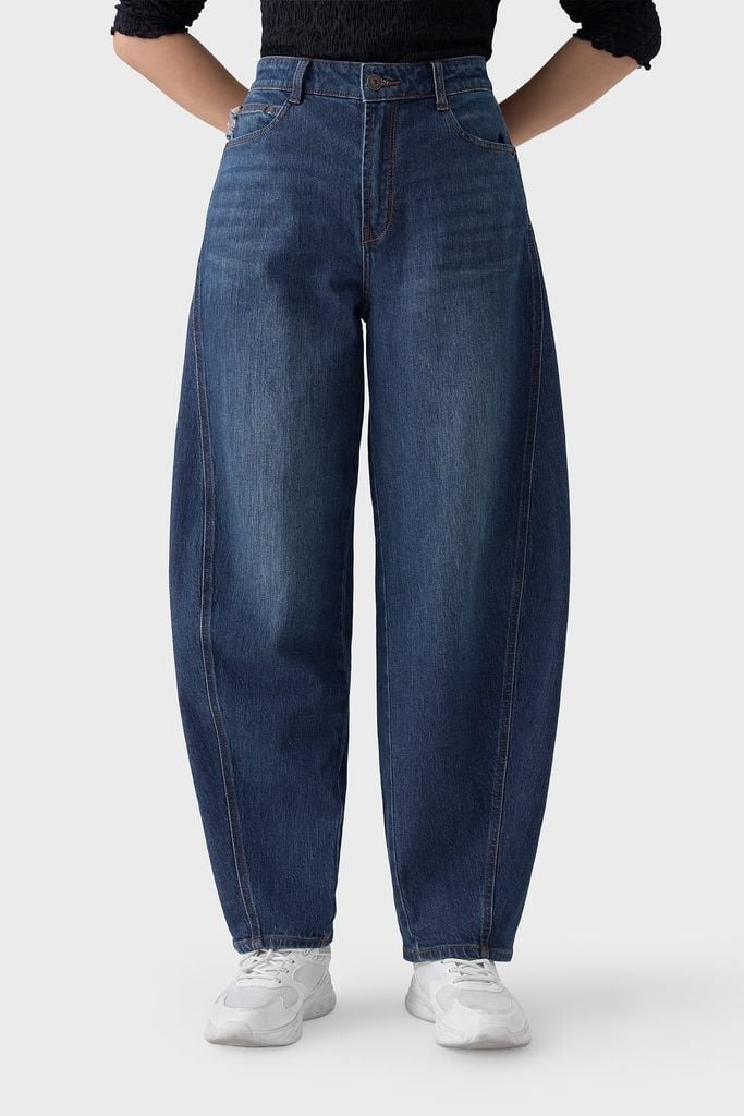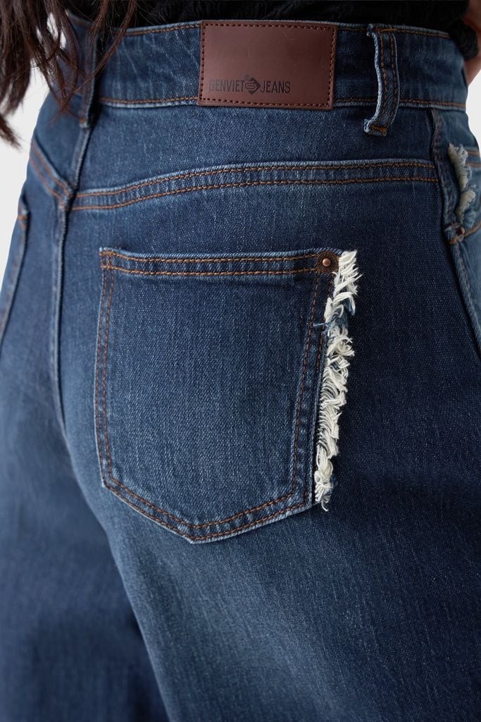 Đường may chắc chắn, có đinh tán (rivet) ở túi để tăng độ bền, màu xanh chàm (indigo).